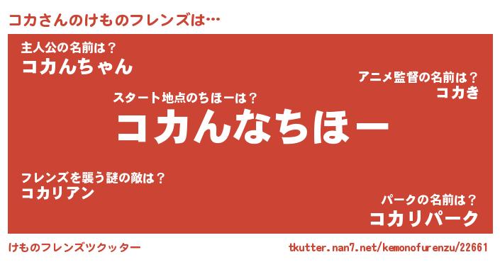 | 男性向けラノベタイトル風あだ名 | 『この素晴らしい世界にコカを!』 |
