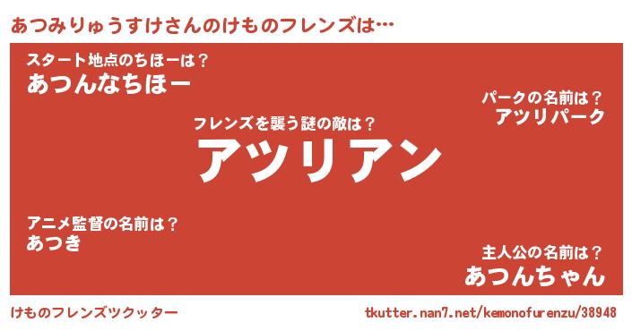 | 男性向けラノベタイトル風あだ名 | 『おまえをオタクにしてやるから、俺をあつみりゅうすけにしてくれ! 』 |