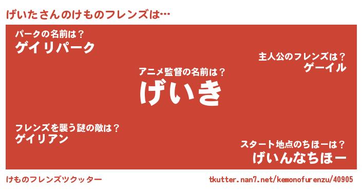 | 意味不明あだ名 | 『住所不定無職げいた(85歳)』『自称げいた』 |