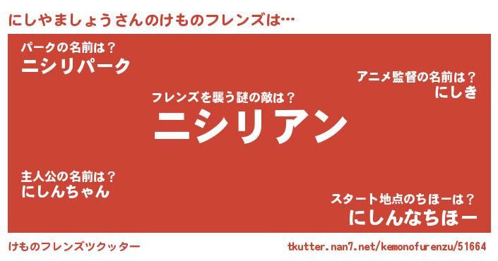 | 男性向けラノベタイトル風あだ名 | 『にしやましょう~年齢イコール彼女いない歴の魔法使い~』 |