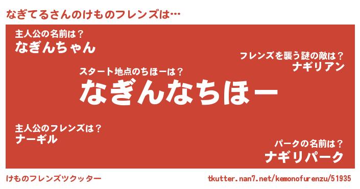 | 意味不明あだ名 | 『ヨモギ科なぎてる属』『自称なぎてる』 |