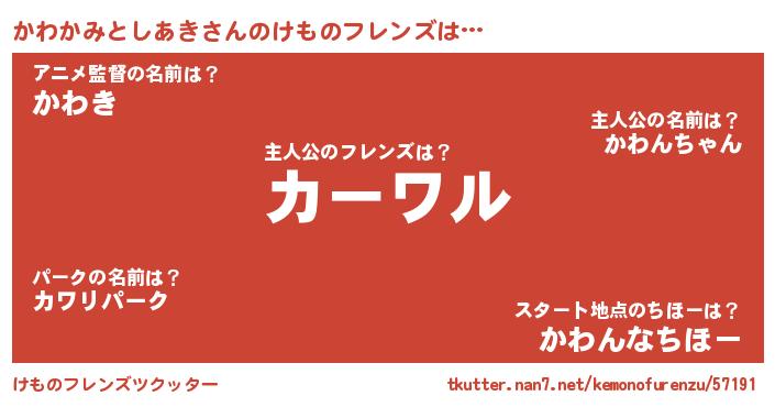 | 男性向けラノベタイトル風あだ名 | 『この素晴らしい世界にかわかみとしあきを!』 |