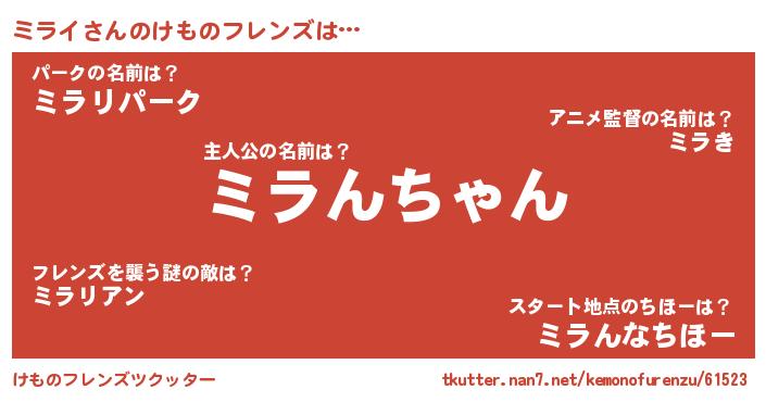| 意味不明あだ名 | 『住所不定無職ミライ(6歳)』『自称ミライ』 |