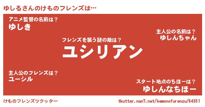 | 男性向けラノベタイトル風あだ名 | 『魔弾の王とゆしる』『ユシルスレイヤー』 |