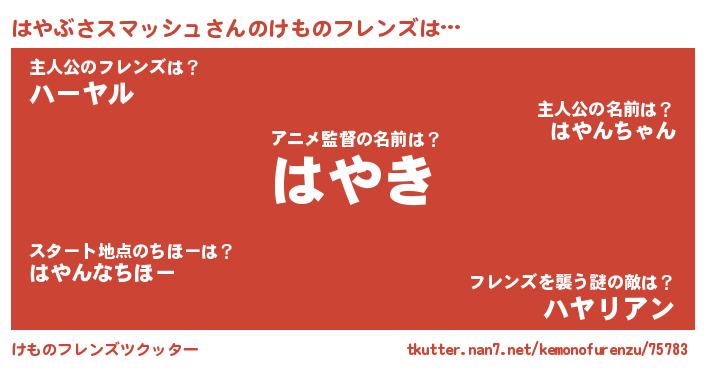 | 男性向けラノベタイトル風あだ名 | 『はやぶさスマッシュの嫁は女の子じゃないと思った?』 |