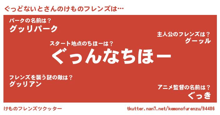 | ことわざ | 壁に耳あり障子に目あり『ぐっどないとに耳ありぐっどないとに目あり』 |