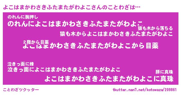 | ツイッター | よこはまかわさきふたまたがわよこさんのツイッターID『fukuyoka_idle』 |