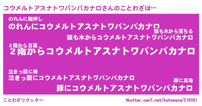 | 番長 | コウメルトアスナトワバンバカナロ、またの名を・・・!『リズミカルコウメルトアスナトワバンバカナロちん』 |