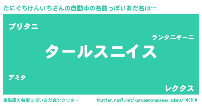 たにぐちけんいちさんの自動車の名前っぽいあだ名は… 『タールスニイス』『プリタニ』『レクタス』 ツクッター #自動車の名前っぽいあだ名ツクッター http://tkutter.nan7.net/kurumanonamaepoiadana/100810/