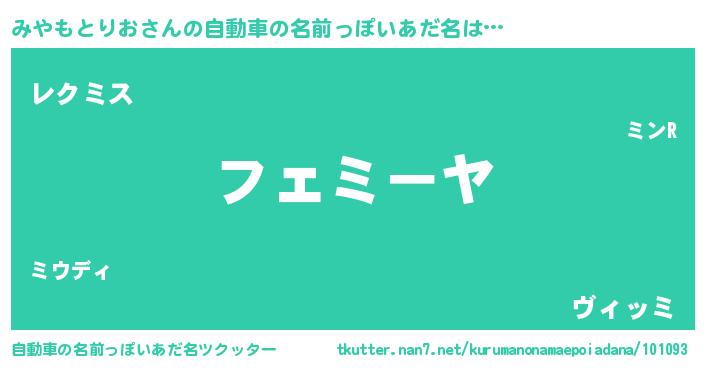 みやもとりおさんの自動車の名前っぽいあだ名は… 『フェミーヤ』『レクミス』『ヴィッミ』 ツクッター #自動車の名前っぽいあだ名ツクッター http://tkutter.nan7.net/kurumanonamaepoiadana/101093/