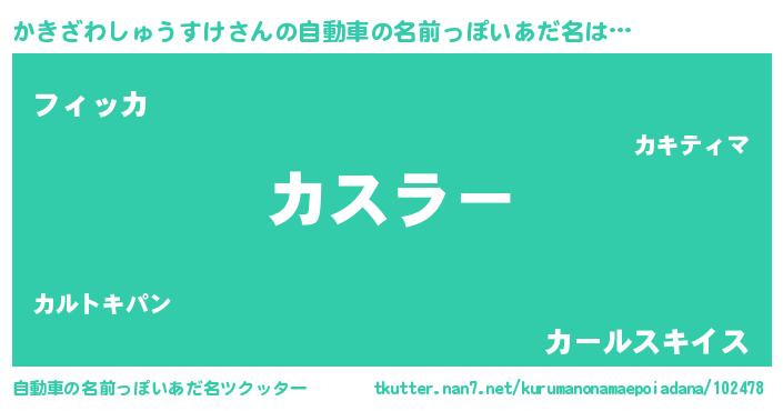 かきざわしゅうすけさんの自動車の名前っぽいあだ名は… 『カスラー』『フィッカ』『カールスキイス』 ツクッター #自動車の名前っぽいあだ名ツクッター http://tkutter.nan7.net/kurumanonamaepoiadana/102478/