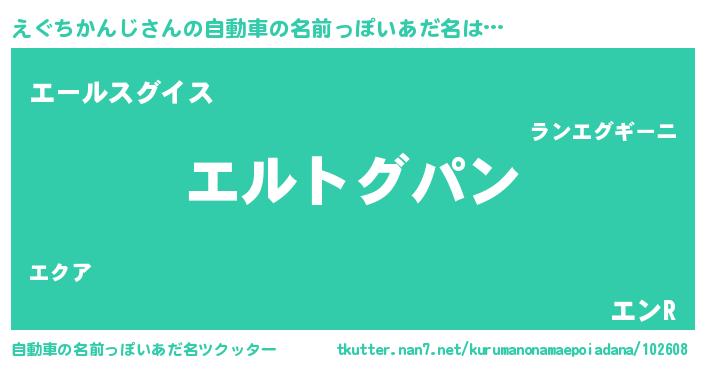えぐちかんじさんの自動車の名前っぽいあだ名は… 『エルトグパン』『エールスグイス』『エンR』 ツクッター #自動車の名前っぽいあだ名ツクッター http://tkutter.nan7.net/kurumanonamaepoiadana/102608/