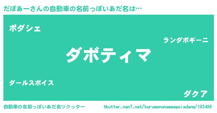 だぼあーさんの自動車の名前っぽいあだ名は… 『ダボティマ』『ポダシェ』『ダクア』 ツクッター #自動車の名前っぽいあだ名ツクッター http://tkutter.nan7.net/kurumanonamaepoiadana/103436/
