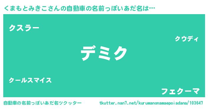 | 女子向けラノベタイトル風あだ名 | 『くまもとみきこの契約王妃』 |