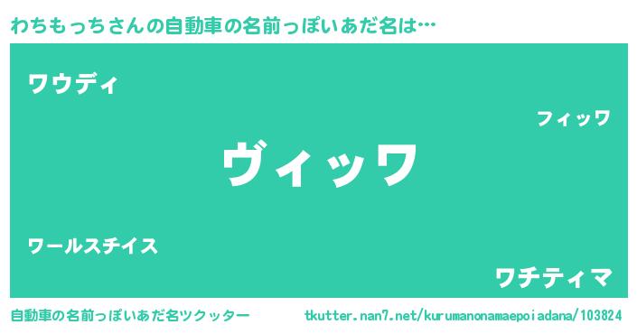 わちもっちさんの自動車の名前っぽいあだ名は… 『ヴィッワ』『ワウディ』『ワチティマ』 ツクッター #自動車の名前っぽいあだ名ツクッター http://tkutter.nan7.net/kurumanonamaepoiadana/103824/
