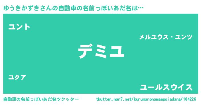 ゆうきかずきさんの自動車の名前っぽいあだ名は… 『デミユ』『ユント』『ユールスウイス』 ツクッター #自動車の名前っぽいあだ名ツクッター http://tkutter.nan7.net/kurumanonamaepoiadana/104226/