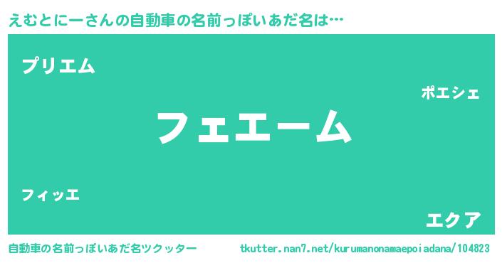 えむとにーさんの自動車の名前っぽいあだ名は… 『フェエーム』『プリエム』『エクア』 ツクッター #自動車の名前っぽいあだ名ツクッター http://tkutter.nan7.net/kurumanonamaepoiadana/104823/