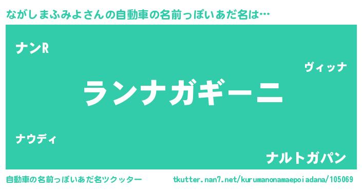 ながしまふみよさんの自動車の名前っぽいあだ名は… 『ランナガギーニ』『ナンR』『ナルトガパン』 ツクッター #自動車の名前っぽいあだ名ツクッター http://tkutter.nan7.net/kurumanonamaepoiadana/105069/