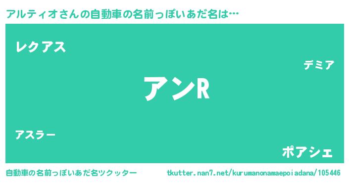 アルティオさんの自動車の名前っぽいあだ名は… 『アンR』『レクアス』『ポアシェ』 ツクッター #自動車の名前っぽいあだ名ツクッター http://tkutter.nan7.net/kurumanonamaepoiadana/105446/