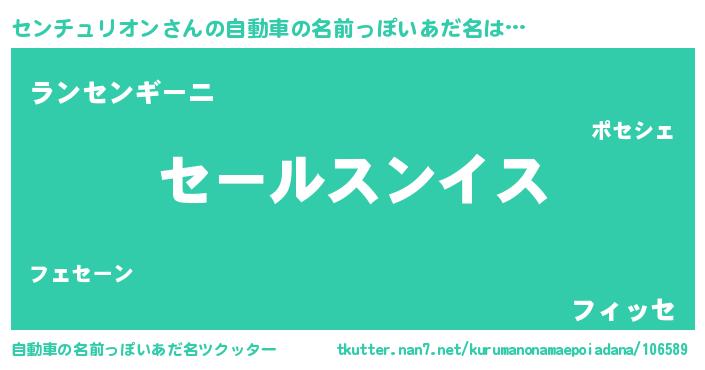 センチュリオンさんの自動車の名前っぽいあだ名は… 『セールスンイス』『ランセンギーニ』『フィッセ』 ツクッター #自動車の名前っぽいあだ名ツクッター http://tkutter.nan7.net/kurumanonamaepoiadana/106589/