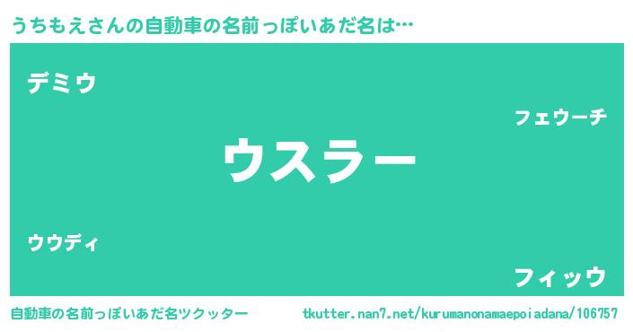 うちもえさんの自動車の名前っぽいあだ名は… 『ウスラー』『デミウ』『フィッウ』 ツクッター #自動車の名前っぽいあだ名ツクッター http://tkutter.nan7.net/kurumanonamaepoiadana/106757/