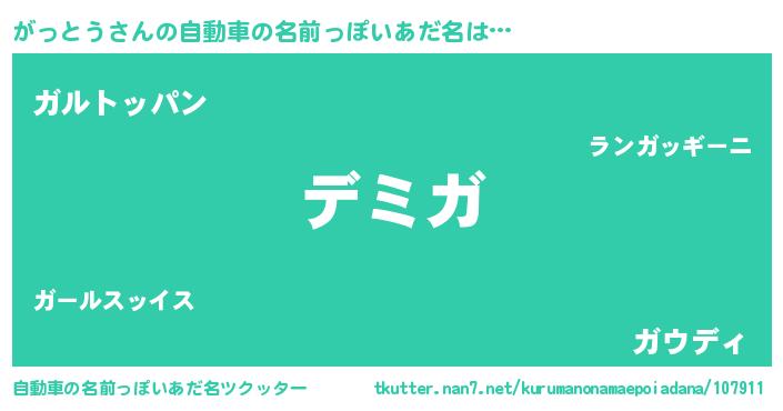 がっとうさんの自動車の名前っぽいあだ名は… 『デミガ』『ガルトッパン』『ガウディ』 ツクッター #自動車の名前っぽいあだ名ツクッター http://tkutter.nan7.net/kurumanonamaepoiadana/107911/