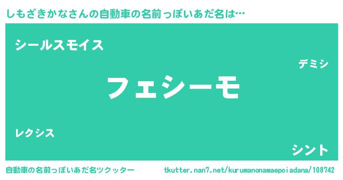 しもざきかなさんの自動車の名前っぽいあだ名は… 『フェシーモ』『シールスモイス』『シント』 ツクッター #自動車の名前っぽいあだ名ツクッター http://tkutter.nan7.net/kurumanonamaepoiadana/108742/