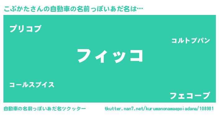 こぶかたさんの自動車の名前っぽいあだ名は… 『フィッコ』『プリコブ』『フェコーブ』 ツクッター #自動車の名前っぽいあだ名ツクッター http://tkutter.nan7.net/kurumanonamaepoiadana/108981/