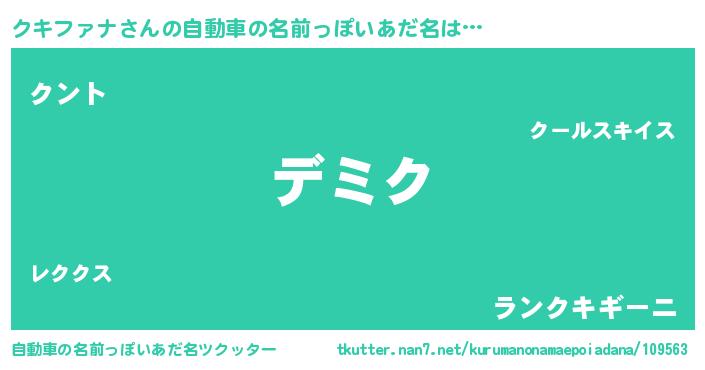 クキファナさんの自動車の名前っぽいあだ名は… 『デミク』『クント』『ランクキギーニ』 ツクッター #自動車の名前っぽいあだ名ツクッター http://tkutter.nan7.net/kurumanonamaepoiadana/109563/