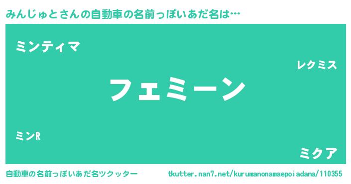 みんじゅとさんの自動車の名前っぽいあだ名は… 『フェミーン』『ミンティマ』『ミクア』 ツクッター #自動車の名前っぽいあだ名ツクッター http://tkutter.nan7.net/kurumanonamaepoiadana/110355/