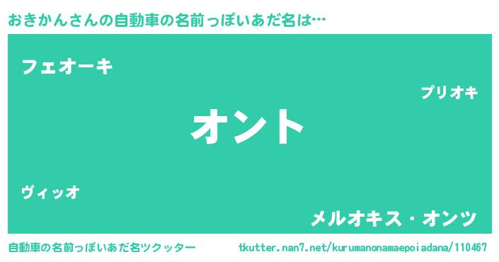 おきかんさんの自動車の名前っぽいあだ名は… 『オント』『フェオーキ』『メルオキス・オンツ』 ツクッター #自動車の名前っぽいあだ名ツクッター http://tkutter.nan7.net/kurumanonamaepoiadana/110467/