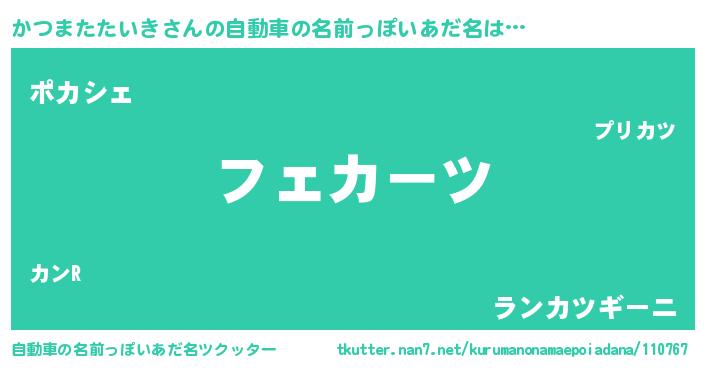 かつまたたいきさんの自動車の名前っぽいあだ名は… 『フェカーツ』『ポカシェ』『ランカツギーニ』 ツクッター #自動車の名前っぽいあだ名ツクッター http://tkutter.nan7.net/kurumanonamaepoiadana/110767/