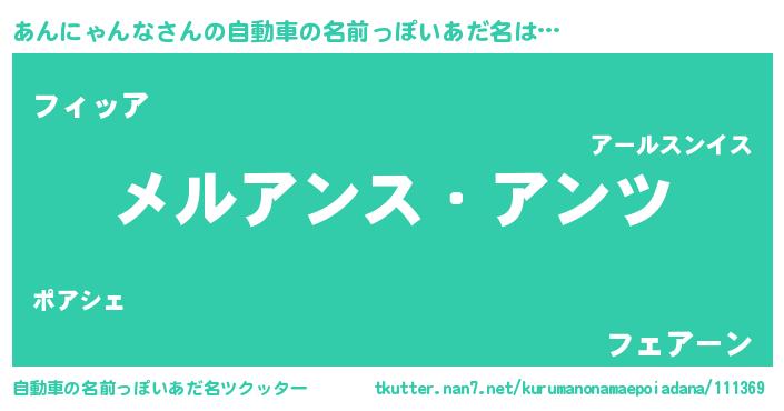 あんにゃんなさんの自動車の名前っぽいあだ名は… 『メルアンス・アンツ』『フィッア』『フェアーン』 ツクッター #自動車の名前っぽいあだ名ツクッター http://tkutter.nan7.net/kurumanonamaepoiadana/111369/