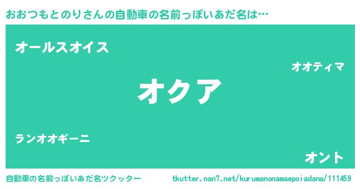 おおつもとのりさんの自動車の名前っぽいあだ名は… 『オクア』『オールスオイス』『オント』 ツクッター #自動車の名前っぽいあだ名ツクッター http://tkutter.nan7.net/kurumanonamaepoiadana/111459/