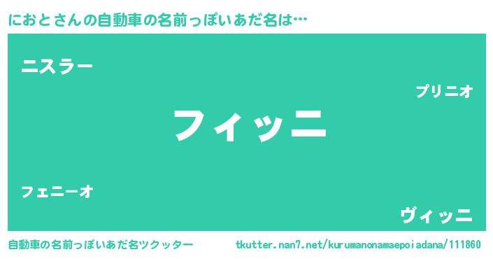 におとさんの自動車の名前っぽいあだ名は… 『フィッニ』『ニスラー』『ヴィッニ』 ツクッター #自動車の名前っぽいあだ名ツクッター http://tkutter.nan7.net/kurumanonamaepoiadana/111860/