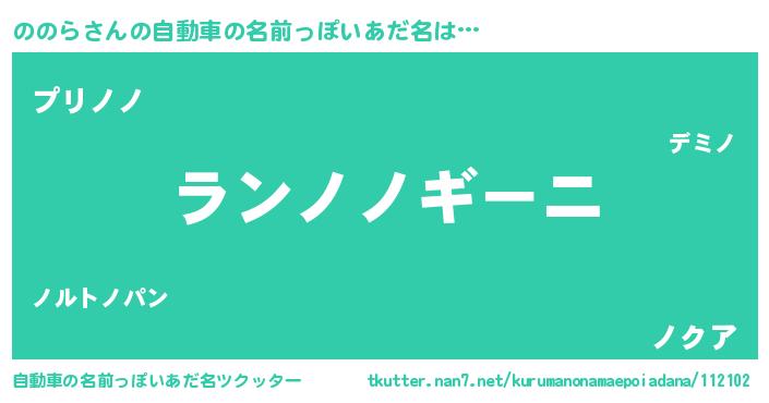 ののらさんの自動車の名前っぽいあだ名は… 『ランノノギーニ』『プリノノ』『ノクア』 ツクッター #自動車の名前っぽいあだ名ツクッター http://tkutter.nan7.net/kurumanonamaepoiadana/112102/