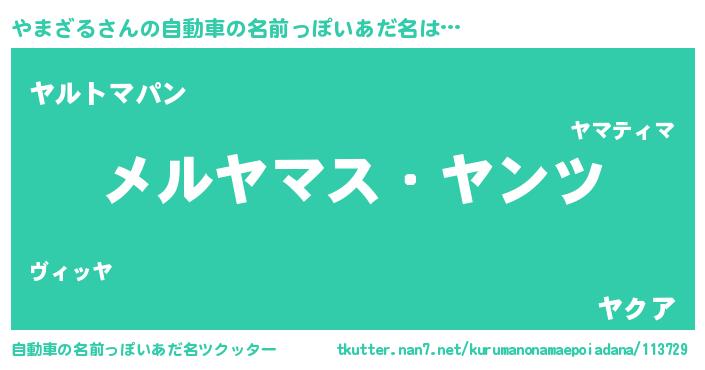やまざるさんの自動車の名前っぽいあだ名は… 『メルヤマス・ヤンツ』『ヤルトマパン』『ヤクア』 ツクッター #自動車の名前っぽいあだ名ツクッター http://tkutter.nan7.net/kurumanonamaepoiadana/113729/
