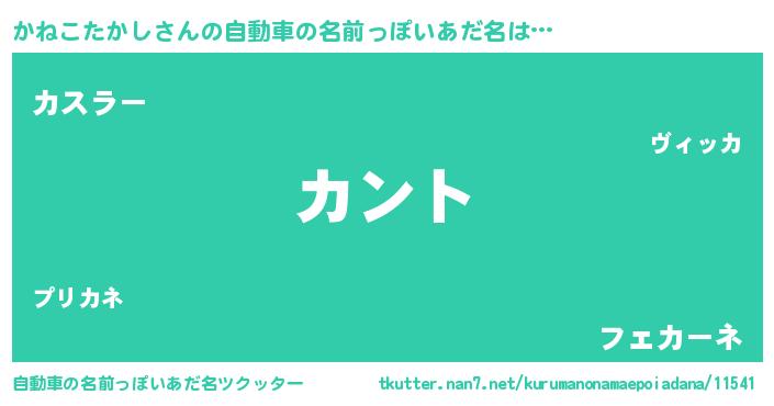 かねこたかしさんの自動車の名前っぽいあだ名は… 『カント』『カスラー』『フェカーネ』 ツクッター #自動車の名前っぽいあだ名ツクッター http://tkutter.nan7.net/kurumanonamaepoiadana/11541/