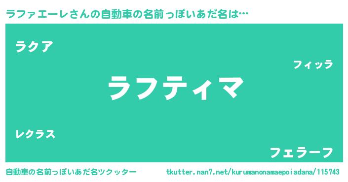 ラファエーレさんの自動車の名前っぽいあだ名は… 『ラフティマ』『ラクア』『フェラーフ』 ツクッター #自動車の名前っぽいあだ名ツクッター http://tkutter.nan7.net/kurumanonamaepoiadana/115743/
