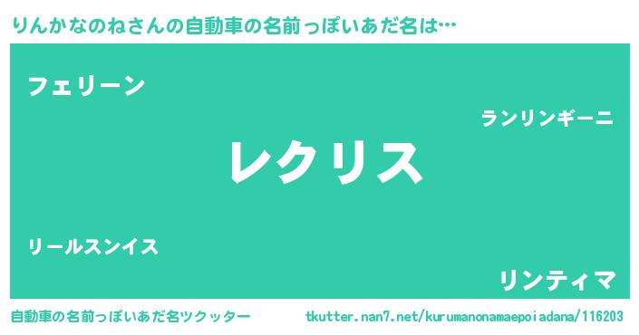 りんかなのねさんの自動車の名前っぽいあだ名は… 『レクリス』『フェリーン』『リンティマ』 ツクッター #自動車の名前っぽいあだ名ツクッター http://tkutter.nan7.net/kurumanonamaepoiadana/116203/
