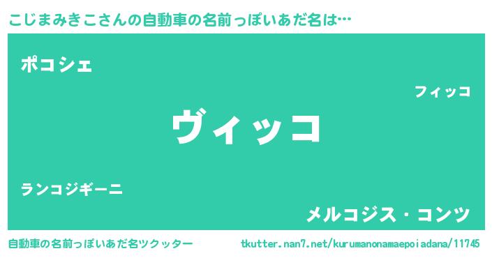 こじまみきこさんの自動車の名前っぽいあだ名は… 『ヴィッコ』『ポコシェ』『メルコジス・コンツ』 ツクッター #自動車の名前っぽいあだ名ツクッター http://tkutter.nan7.net/kurumanonamaepoiadana/11745/