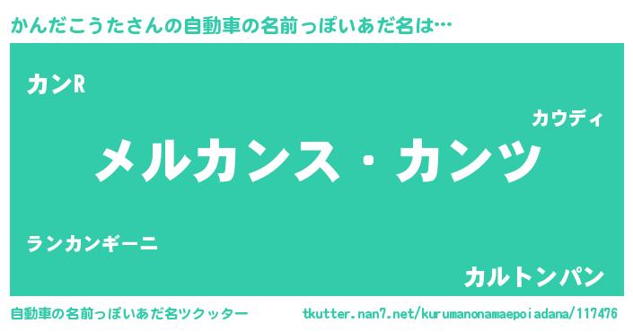 かんだこうたさんの自動車の名前っぽいあだ名は… 『メルカンス・カンツ』『カンR』『カルトンパン』 ツクッター #自動車の名前っぽいあだ名ツクッター http://tkutter.nan7.net/kurumanonamaepoiadana/117476/