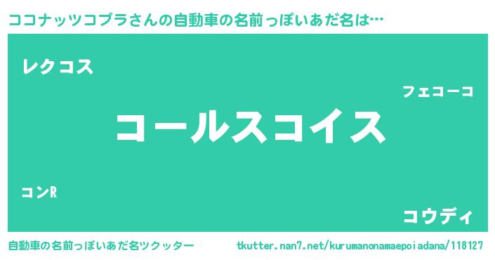 | 男性向けラノベタイトル風あだ名 | 『ココナッツコプラ~年齢イコール彼女いない歴の魔法使い~』 |