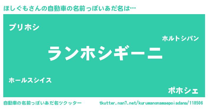 ほしぐもさんの自動車の名前っぽいあだ名は… 『ランホシギーニ』『プリホシ』『ポホシェ』 ツクッター #自動車の名前っぽいあだ名ツクッター http://tkutter.nan7.net/kurumanonamaepoiadana/118506/