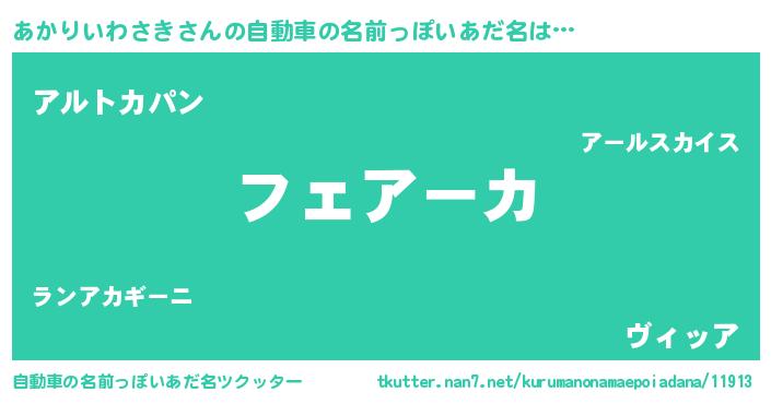 あかりいわさきさんの自動車の名前っぽいあだ名は… 『フェアーカ』『アルトカパン』『ヴィッア』 ツクッター #自動車の名前っぽいあだ名ツクッター http://tkutter.nan7.net/kurumanonamaepoiadana/11913/