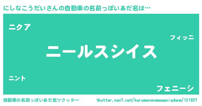 | 男性向けラノベタイトル風あだ名 | 『転生したらにしなこうだいだった件』 |