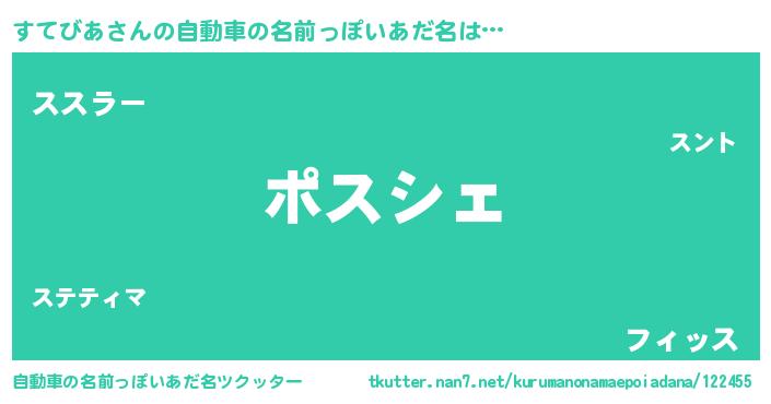 すてびあさんの自動車の名前っぽいあだ名は… 『ポスシェ』『ススラー』『フィッス』 ツクッター #自動車の名前っぽいあだ名ツクッター http://tkutter.nan7.net/kurumanonamaepoiadana/122455/