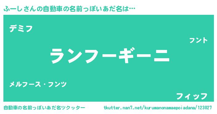 ふーしさんの自動車の名前っぽいあだ名は… 『ランフーギーニ』『デミフ』『フィッフ』 ツクッター #自動車の名前っぽいあだ名ツクッター http://tkutter.nan7.net/kurumanonamaepoiadana/123027/