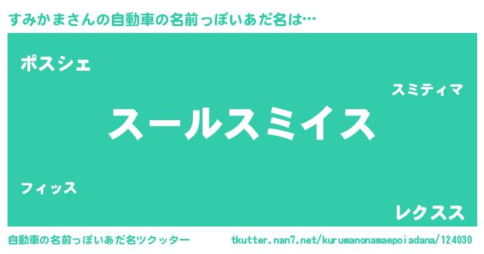 すみかまさんの自動車の名前っぽいあだ名は… 『スールスミイス』『ポスシェ』『レクスス』 ツクッター #自動車の名前っぽいあだ名ツクッター http://tkutter.nan7.net/kurumanonamaepoiadana/124030/