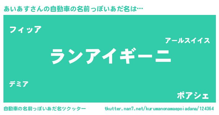 あいあすさんの自動車の名前っぽいあだ名は… 『ランアイギーニ』『フィッア』『ポアシェ』 ツクッター #自動車の名前っぽいあだ名ツクッター http://tkutter.nan7.net/kurumanonamaepoiadana/124364/